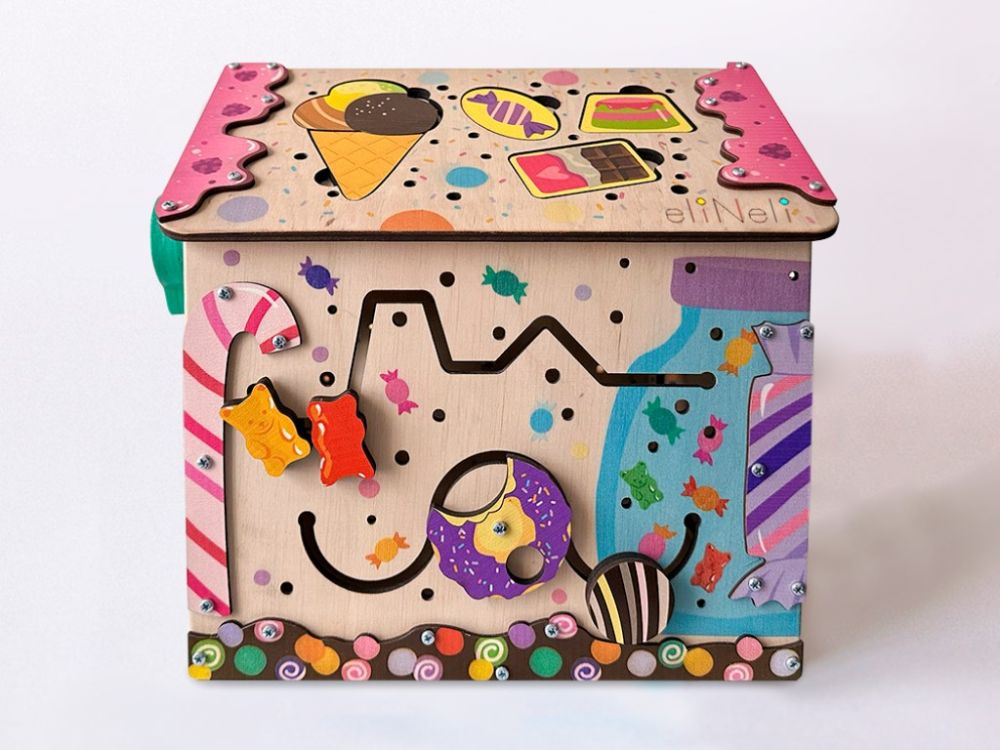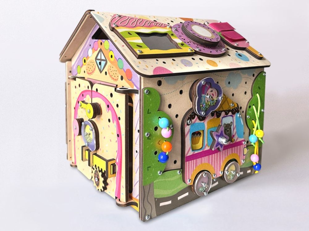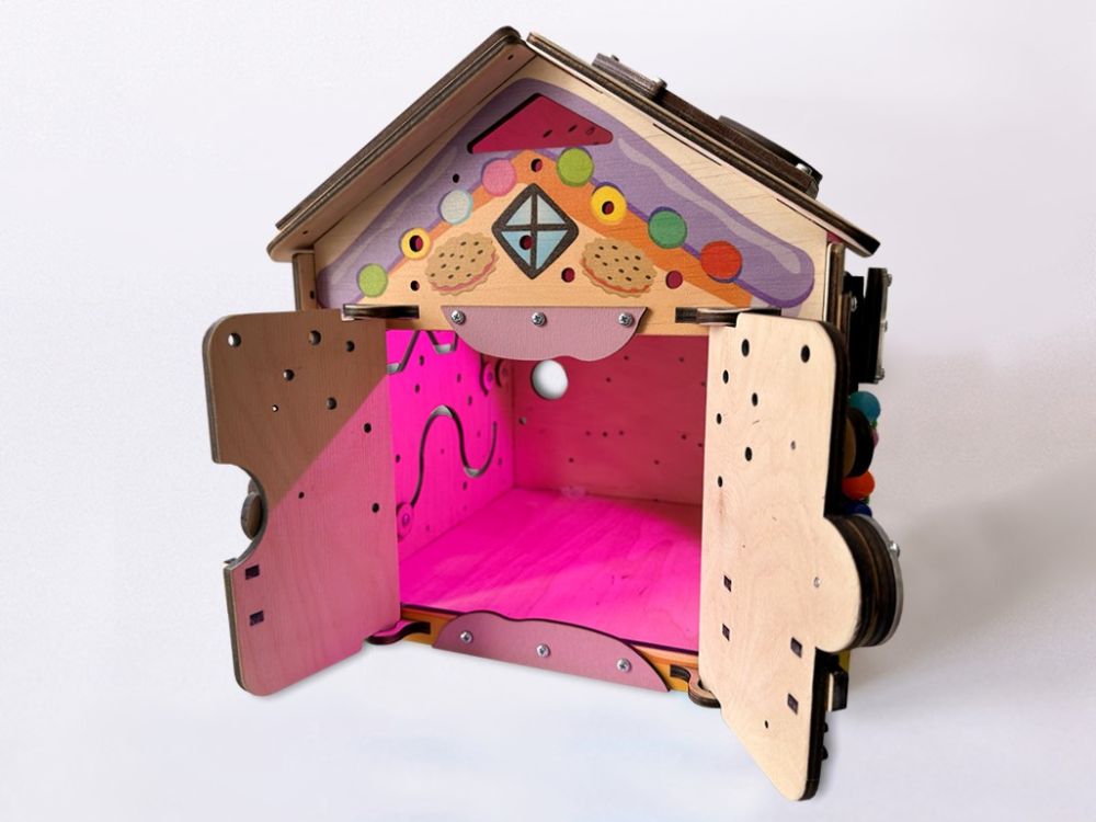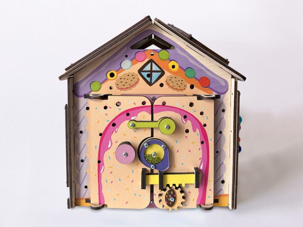 Activity board domeček zavede děti do fantastického světa sladkých dobrot, cukrovinek. Montessori prvky na activity board domečku umožňují dětem všestranně se rozvíjet díky své přirozené zvídavosti.
