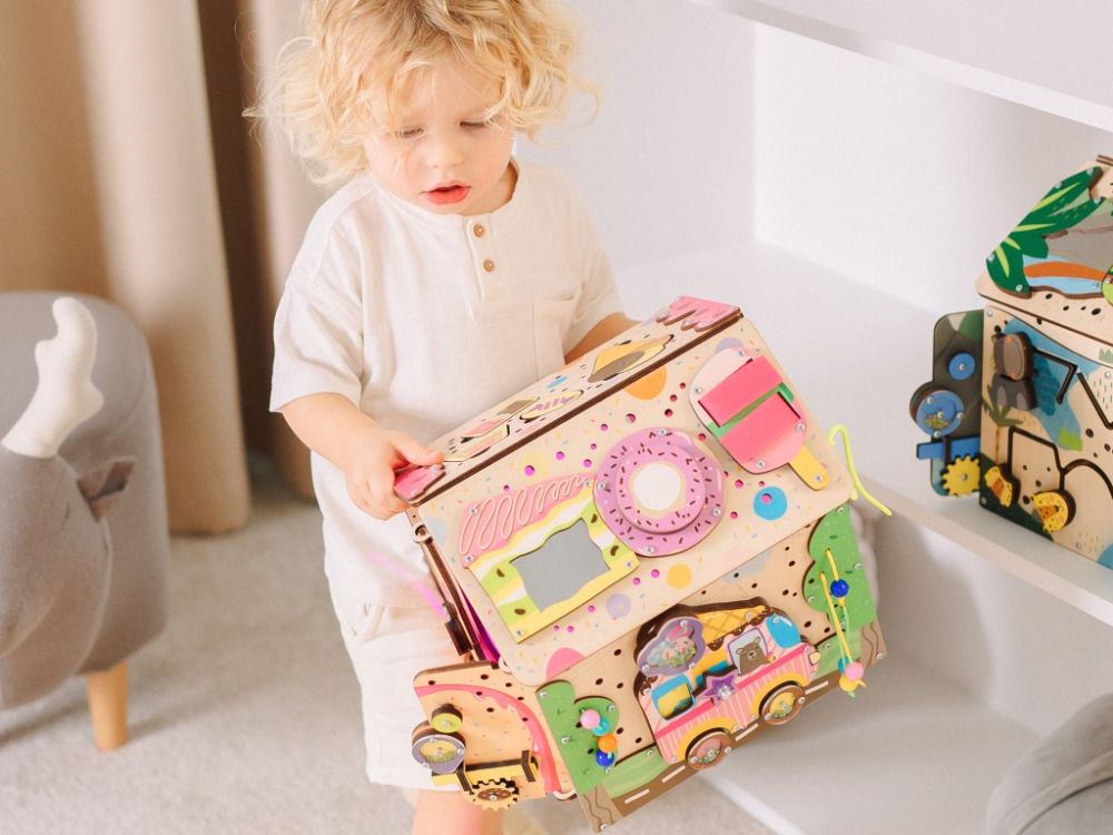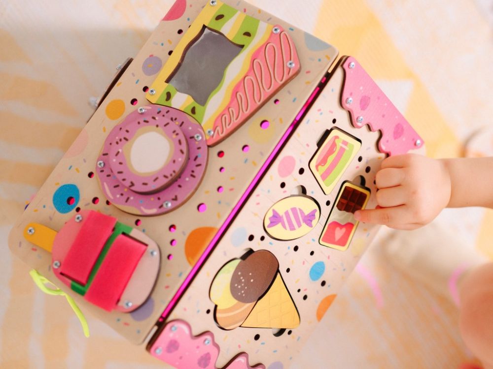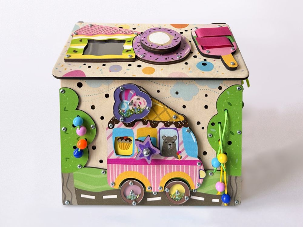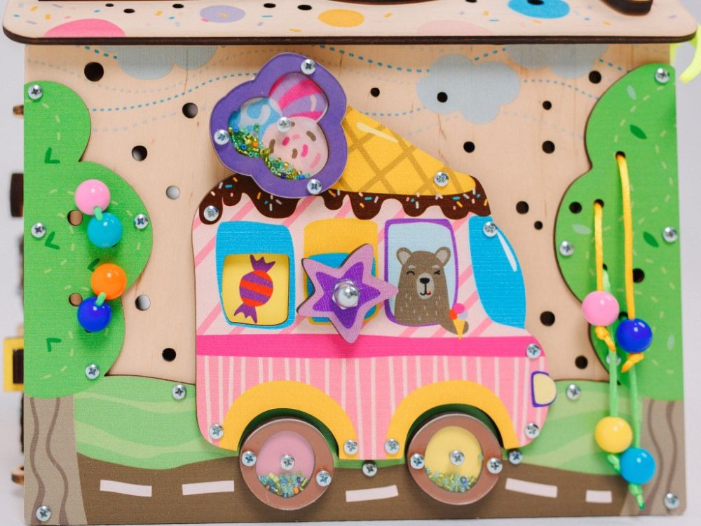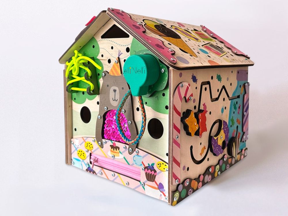 Activity board domeček zavede děti do fantastického světa sladkých dobrot, cukrovinek. Montessori prvky na activity board domečku umožňují dětem všestranně se rozvíjet díky své přirozené zvídavosti.