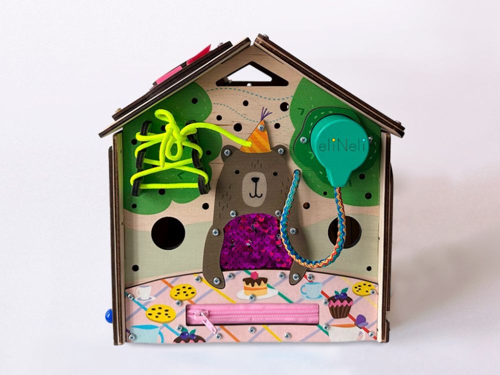 Strana s mlsným medvídkem, který láka k pohlazení svými růžovými flitry na bříšku, děti naučí zapínat zip, zavazovat tkaničky nebo zastrčit zástrčku do zásuvky. To jsou všechno praktické dovednosti, které se dětem budou hodit. Na domečku mohou děti trénovat a ještě si užít zábavu.