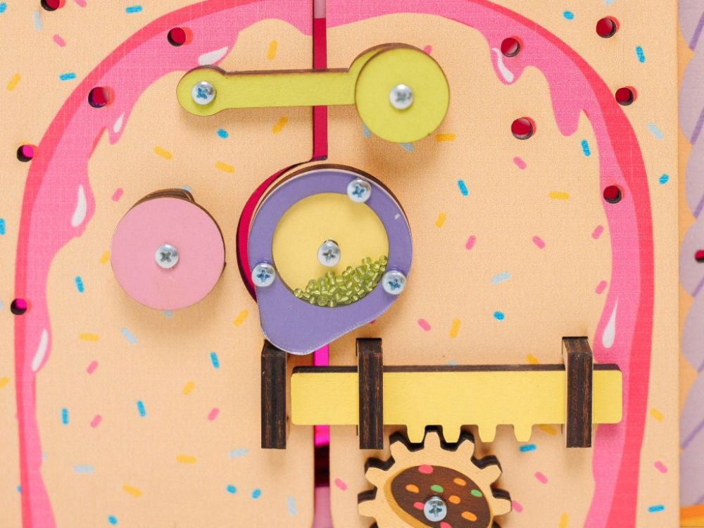 Domeček activity board - Sladkosti je složen ze šesti desek s hracími a montessori prvky zaměřenými na zručnost, logiku, kreativitu a trpělivost. Domeček vtáhne děti do světa objevování a fantazie, kde si samy hrají a učí se tím nejpřirozenějším způsobem, pomocí hry. Každá strana activity board domečku je originální. Strana s montessori prvky děti zabaví a naučí je praktickým dovednostem.